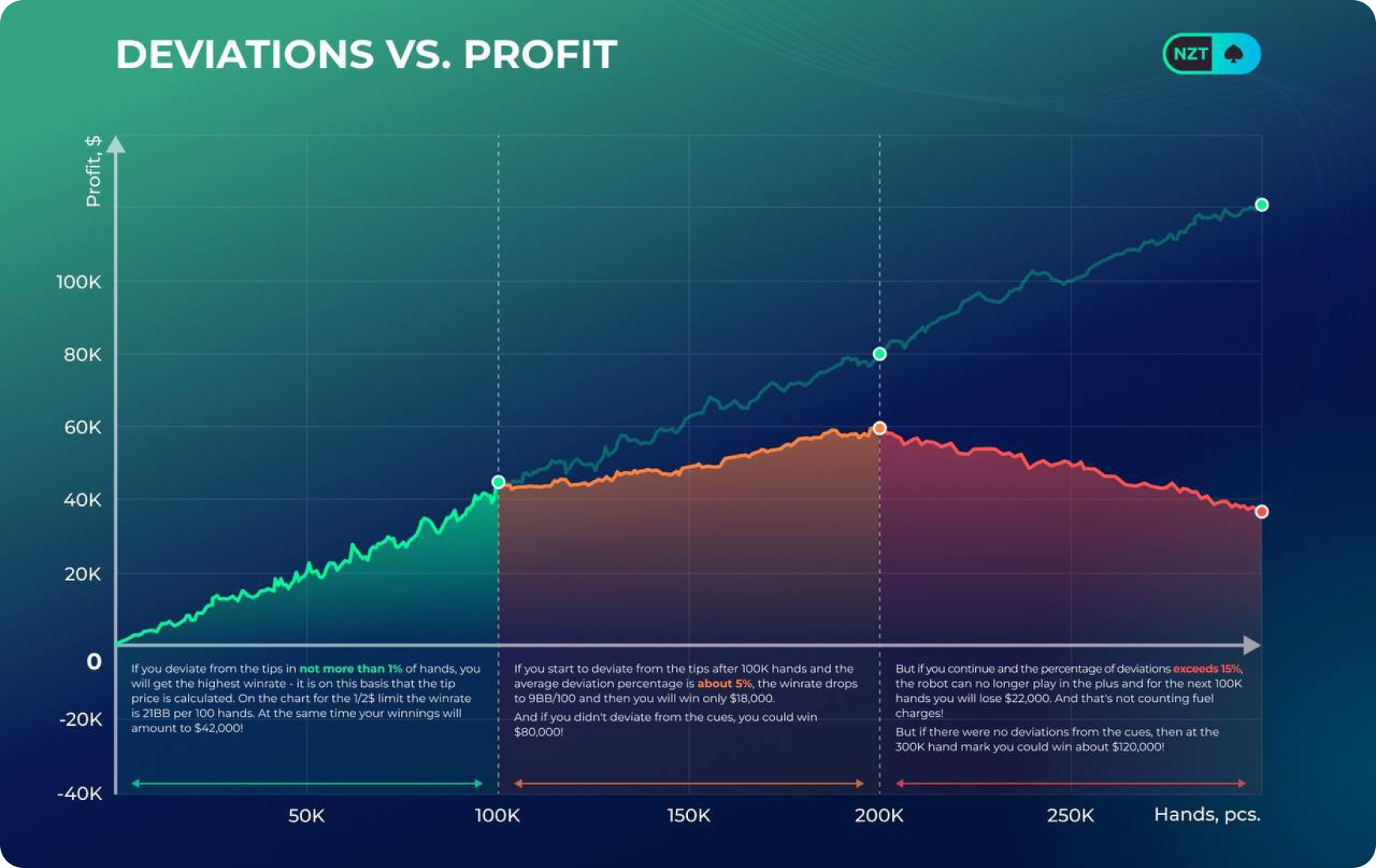O sucesso do jogador dependerá da distância e de quão precisamente ele seguirá as dicas do NZT Poker. Geralmente, a expectativa matemática supera 10 bb/100 mãos.